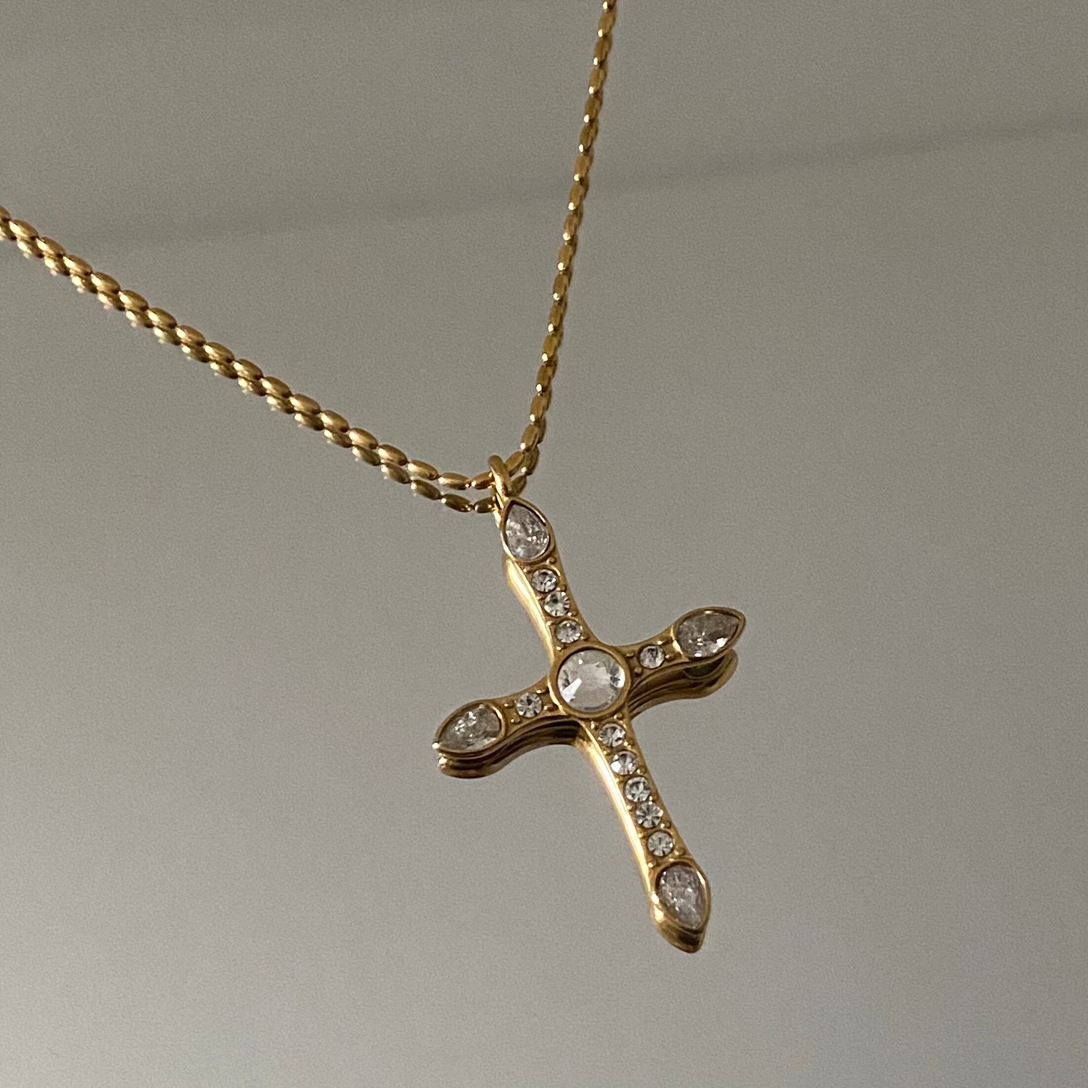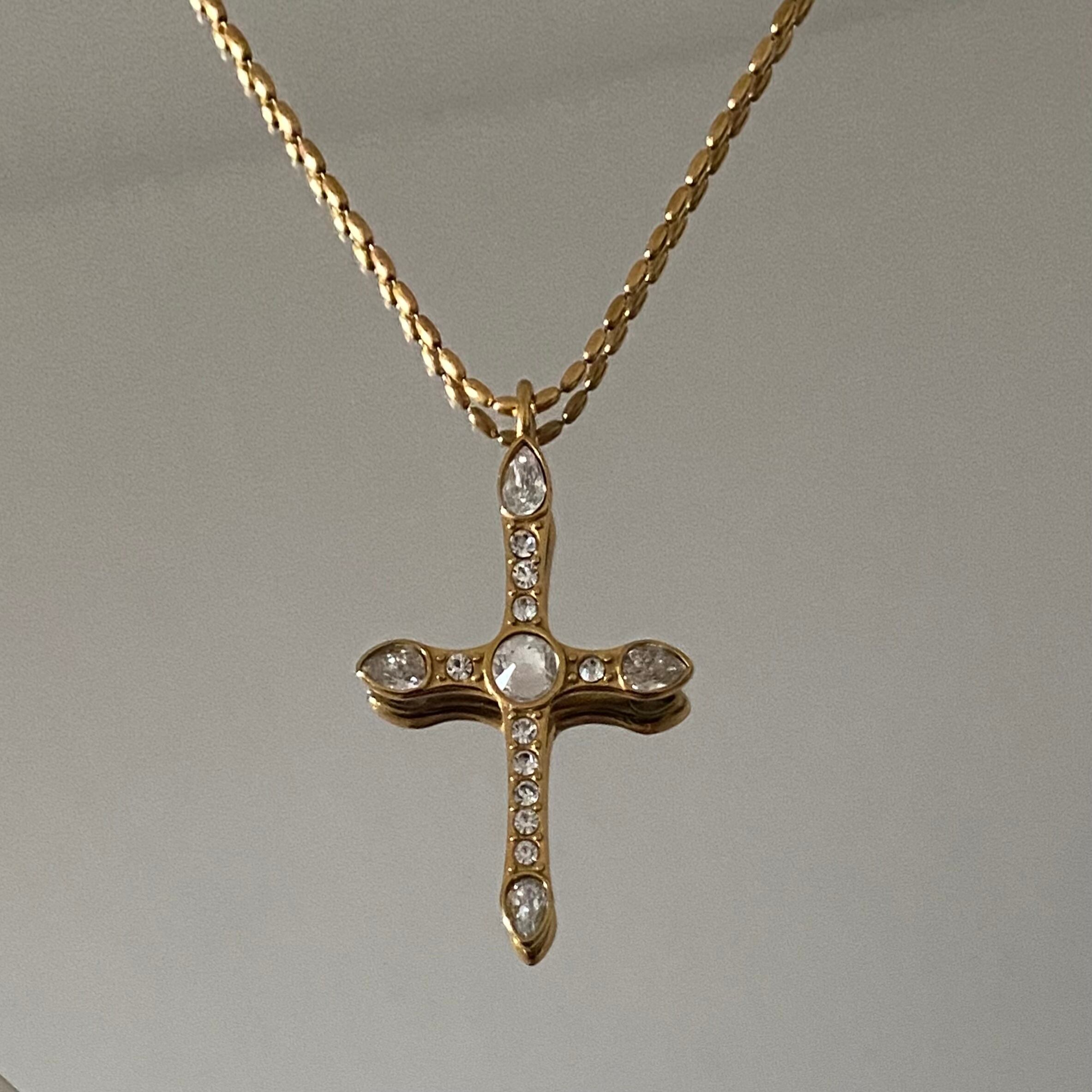 【 STONE FILLED CROSS NECKLACE (PVD) 】