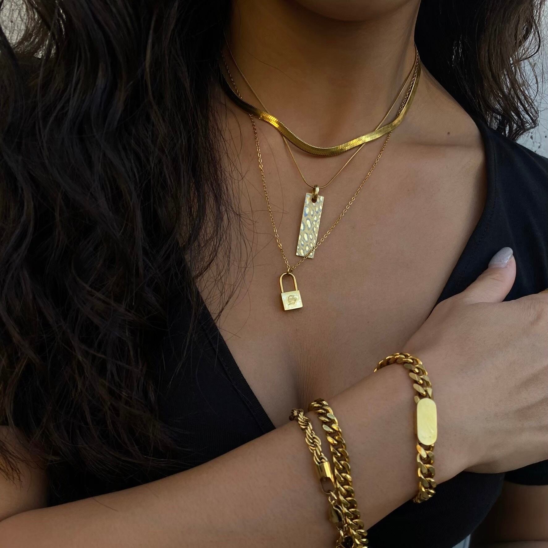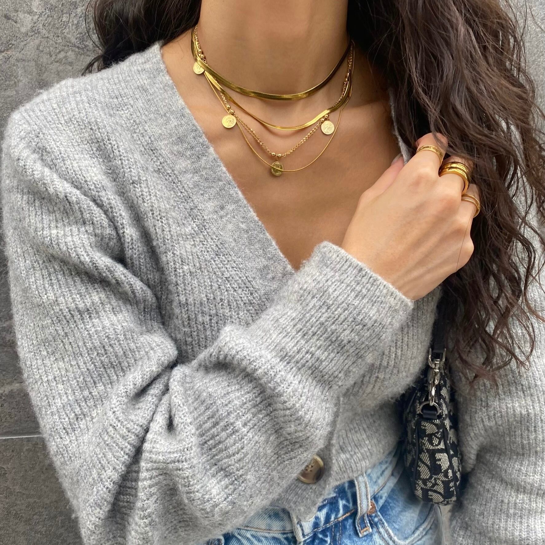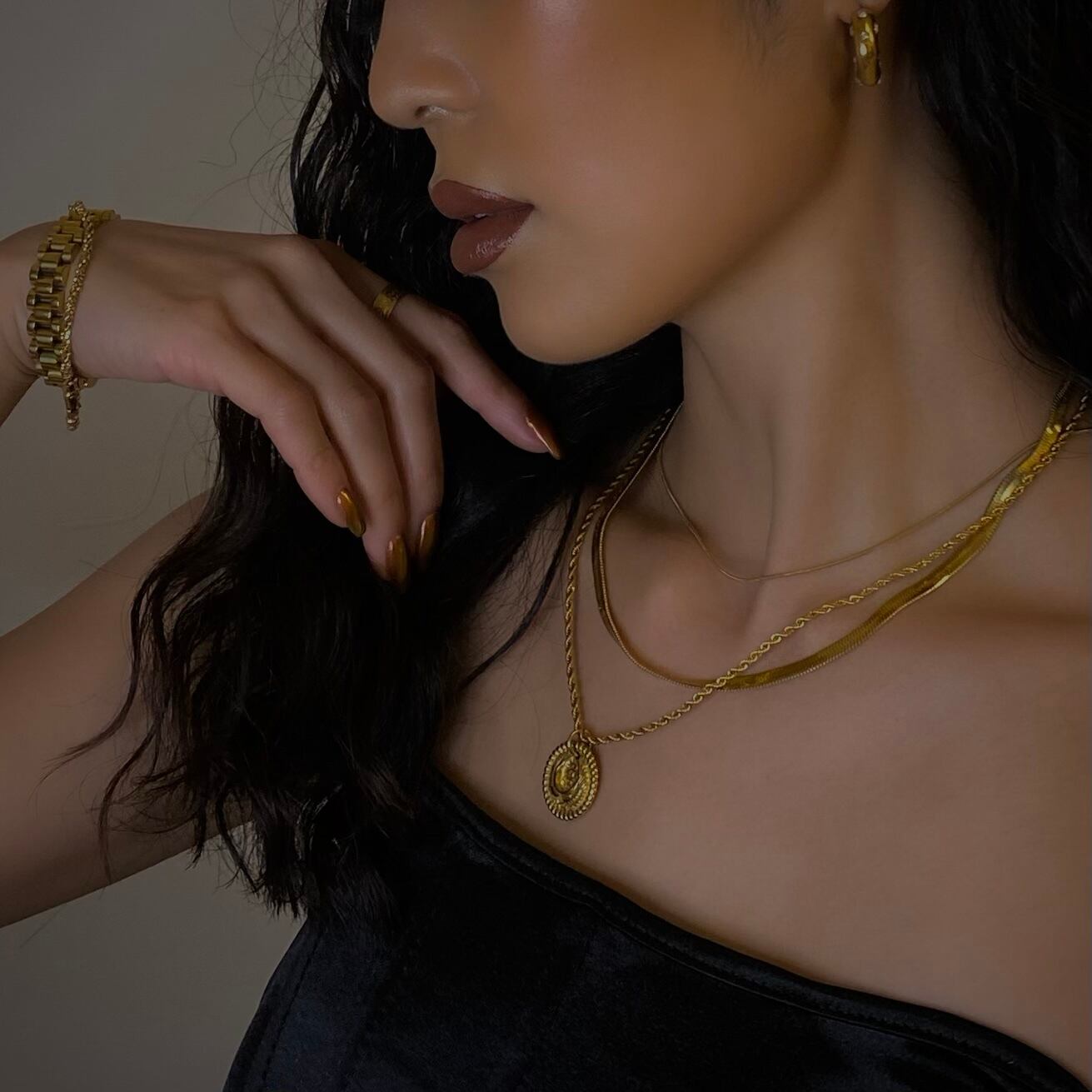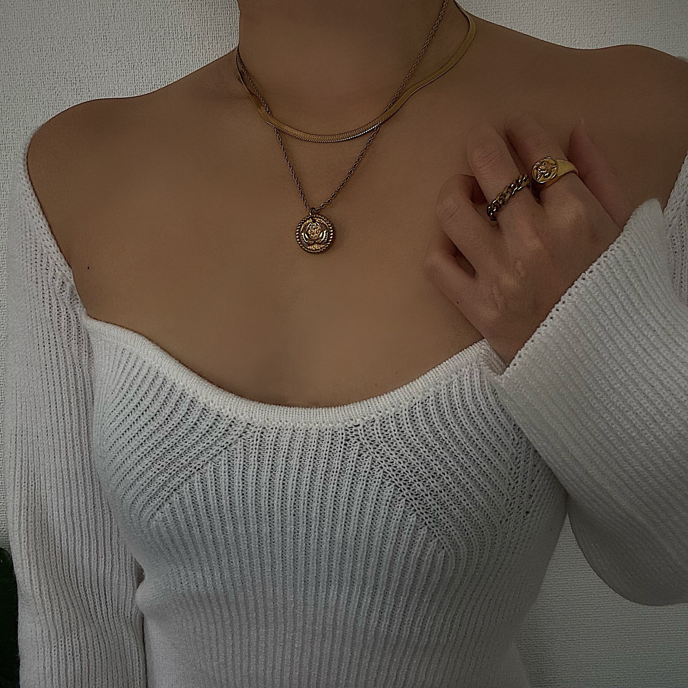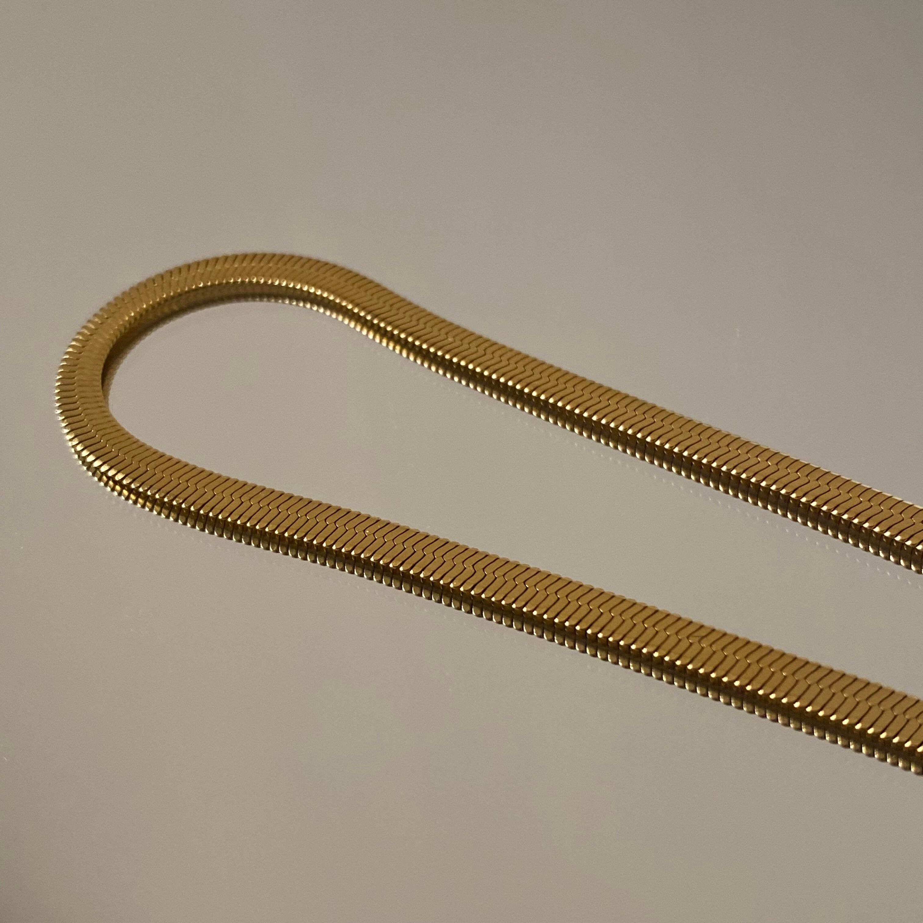首元におしゃれな印象をもたせるのにオススメなスネイクチェーン、フラットなデザインは首元にフィットしエレガントなスタイルに仕上げます。
