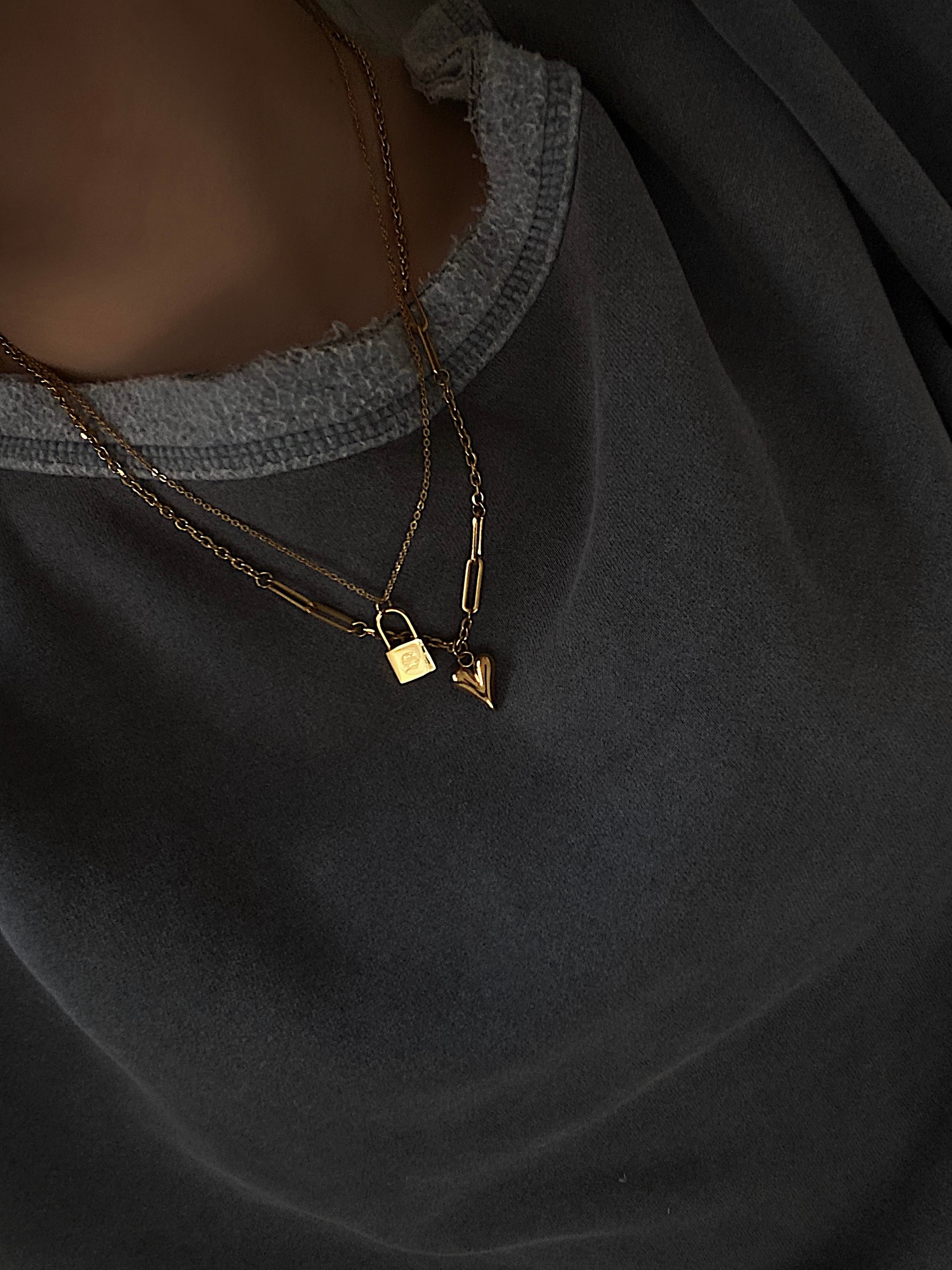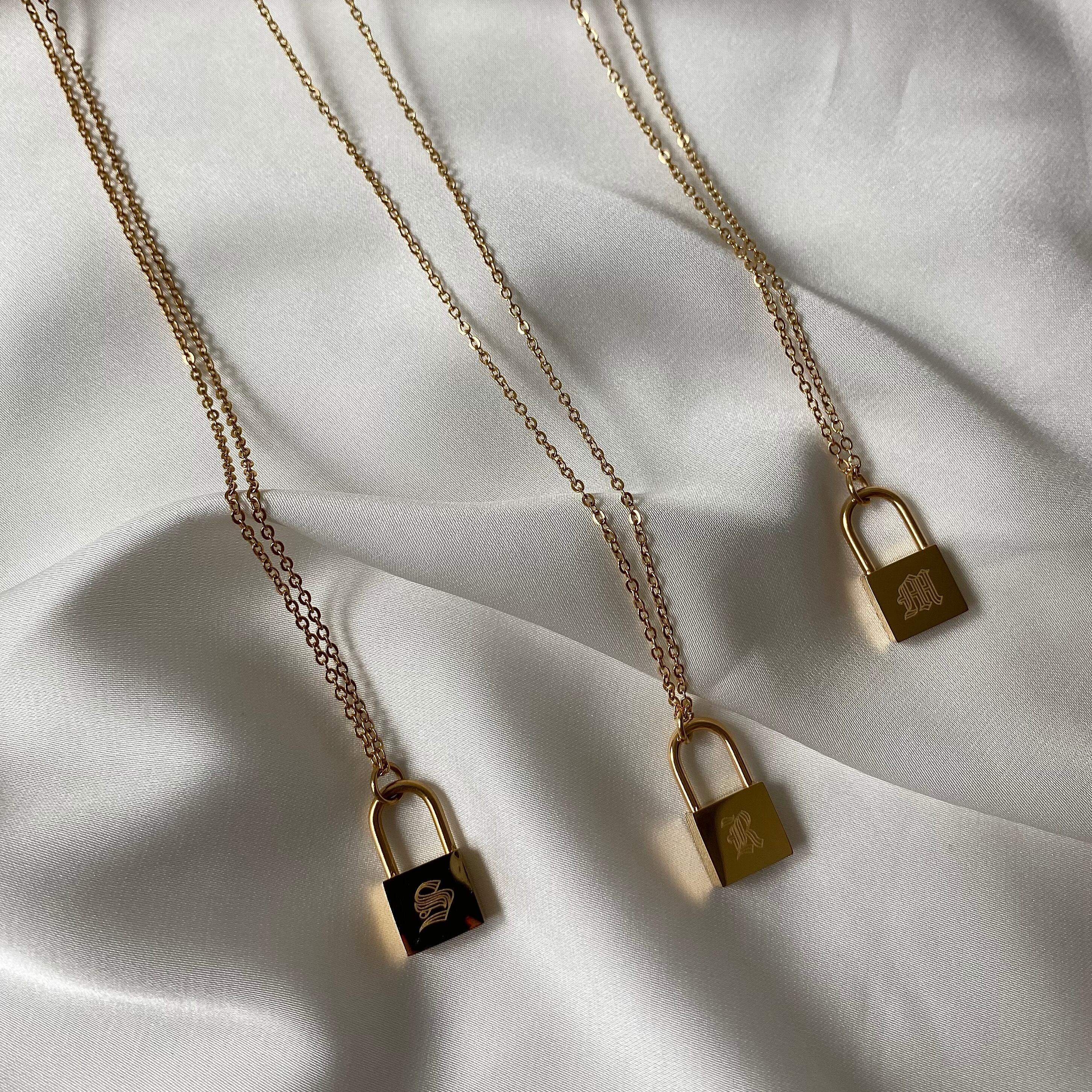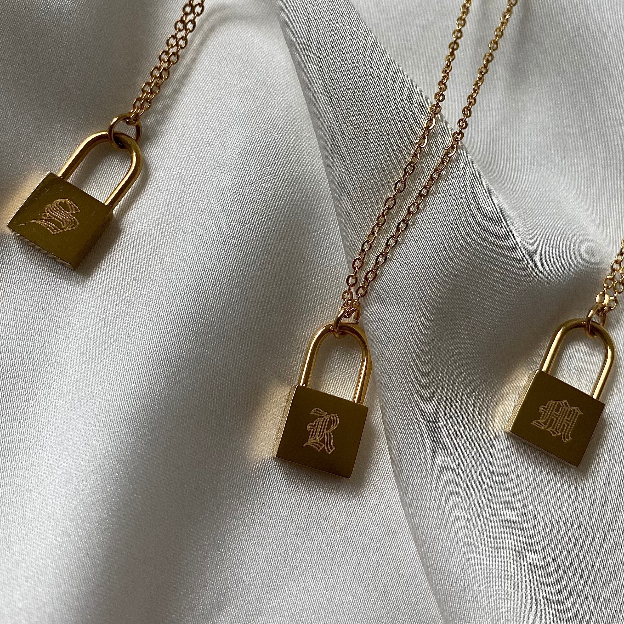 流行りのパドロックペンダントにイニシャルが刻印されたネックレス。