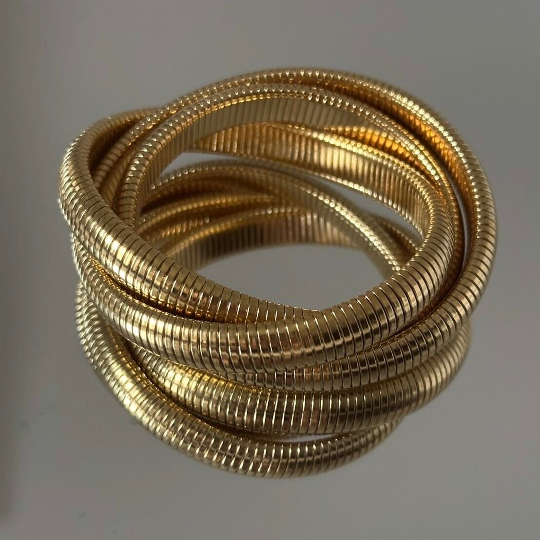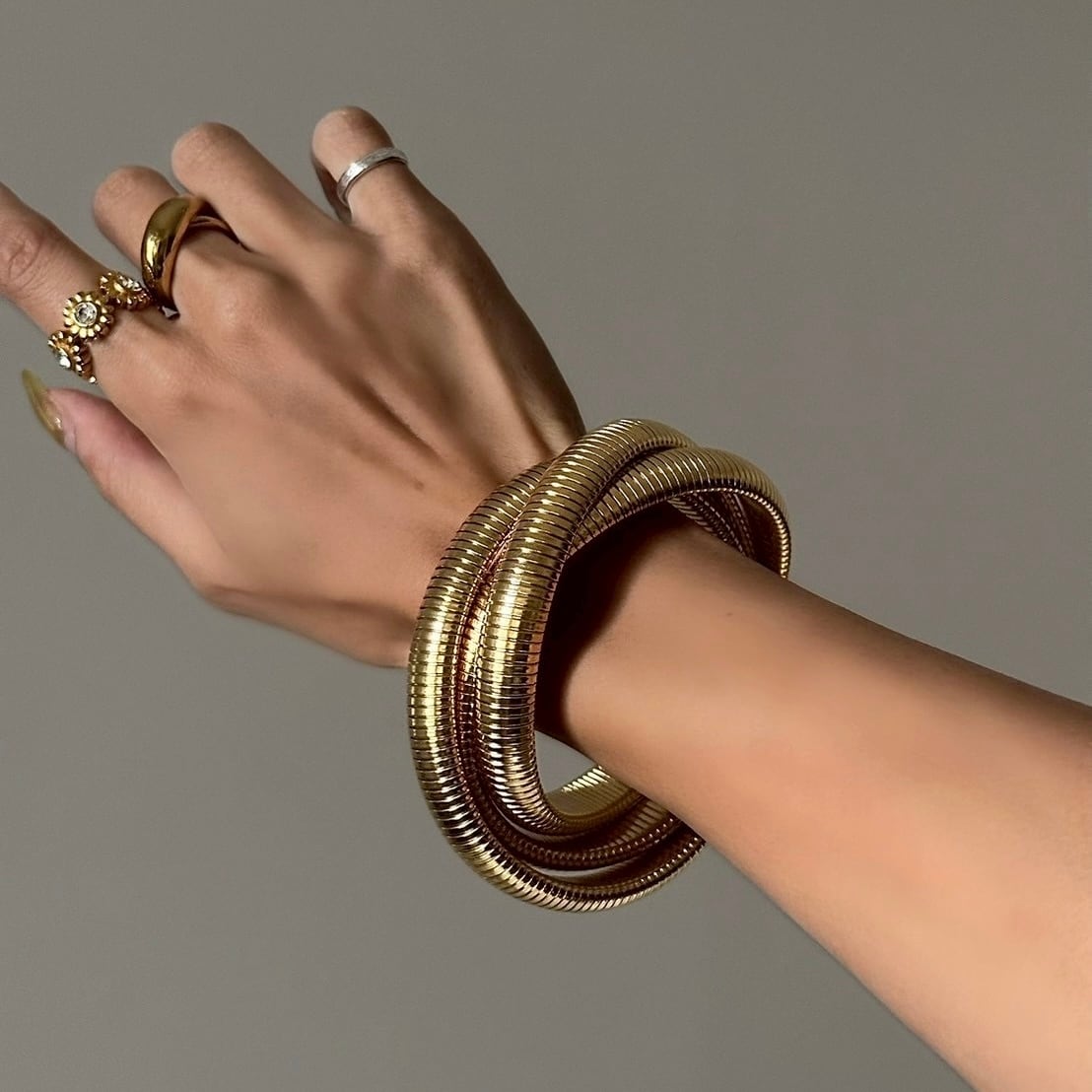 インパクトのあるサイズ感で、シンプルなゴールドブレスをレイヤードした3連ブレス。