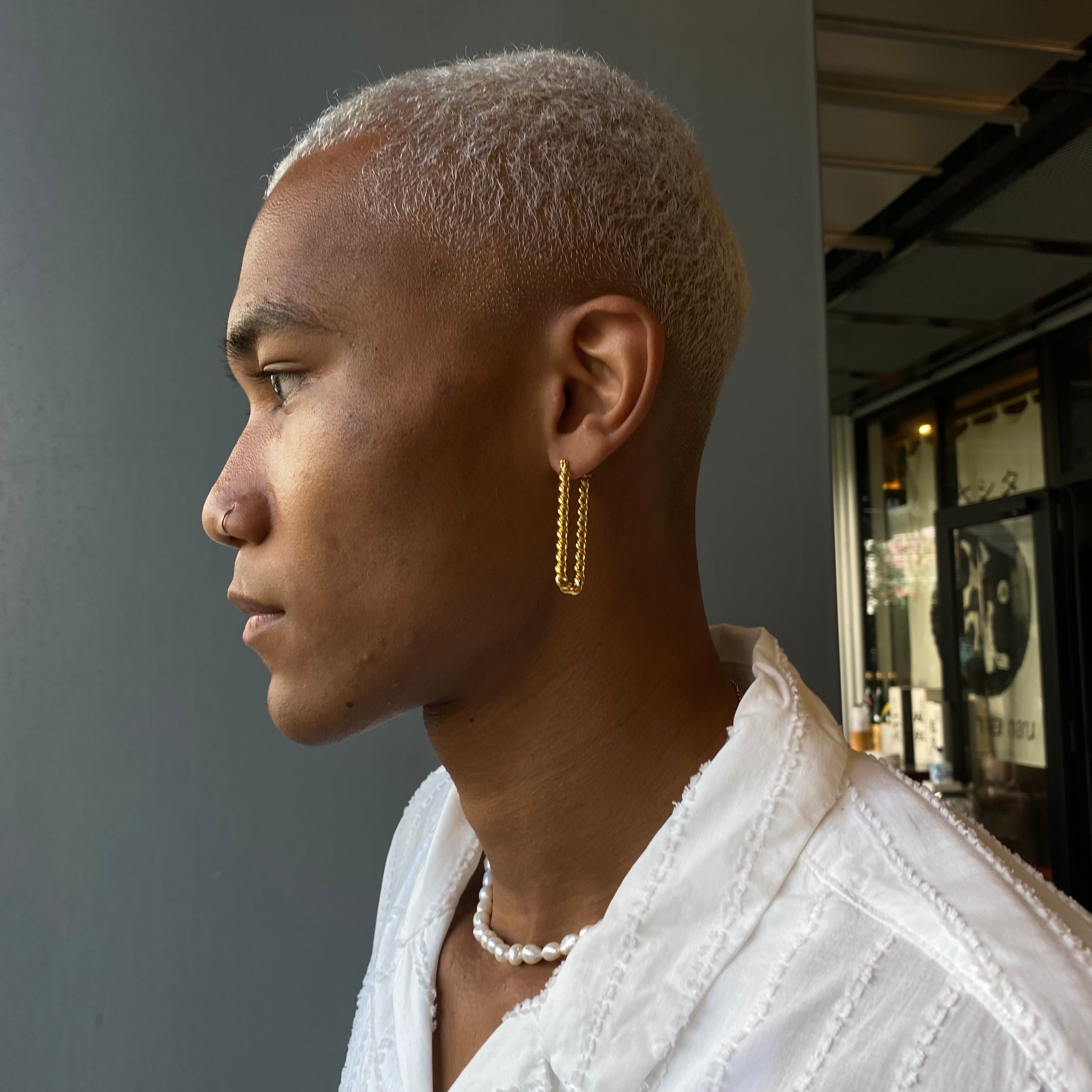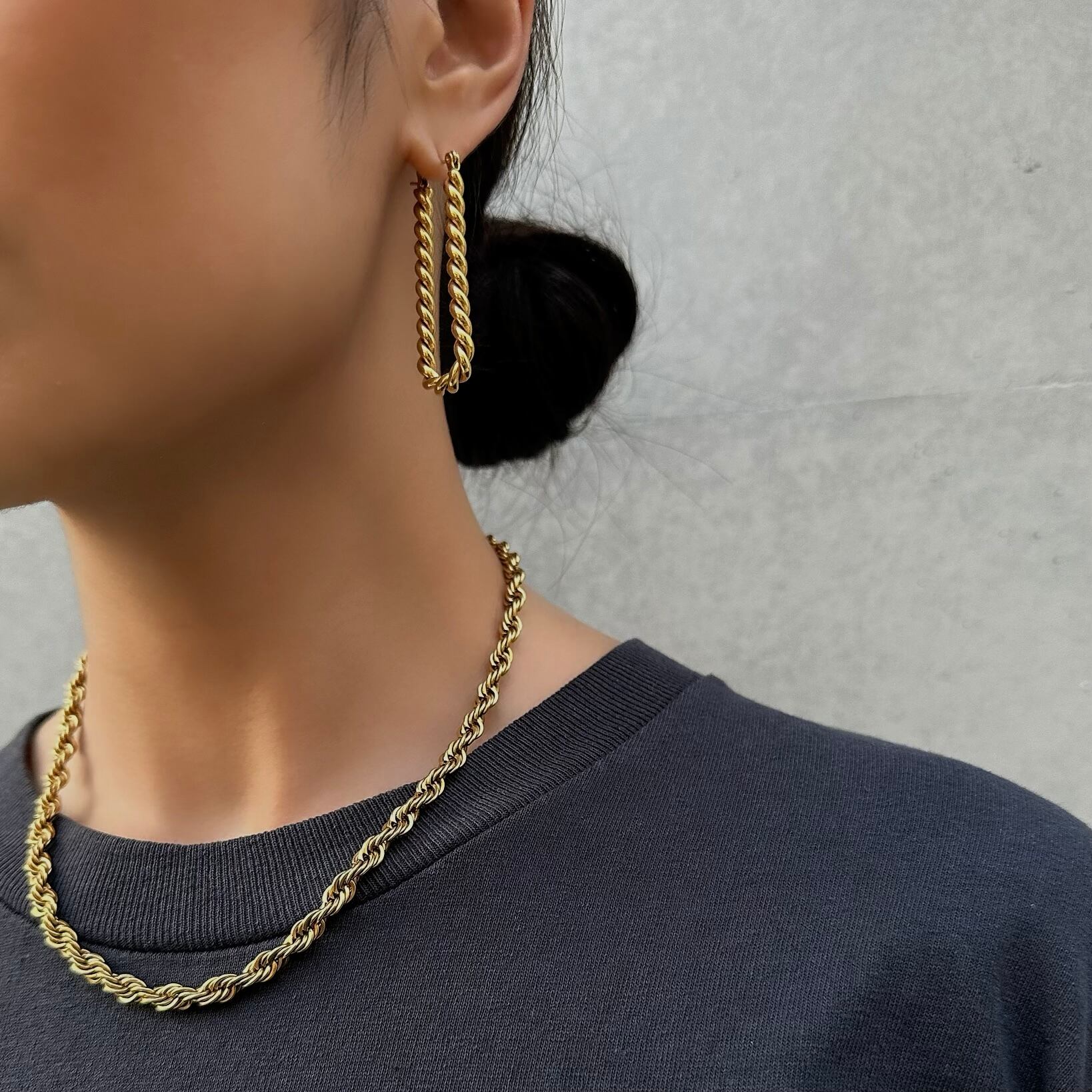 程よいサイズ感で耳元をさりげなく飾るロープフープピアス。