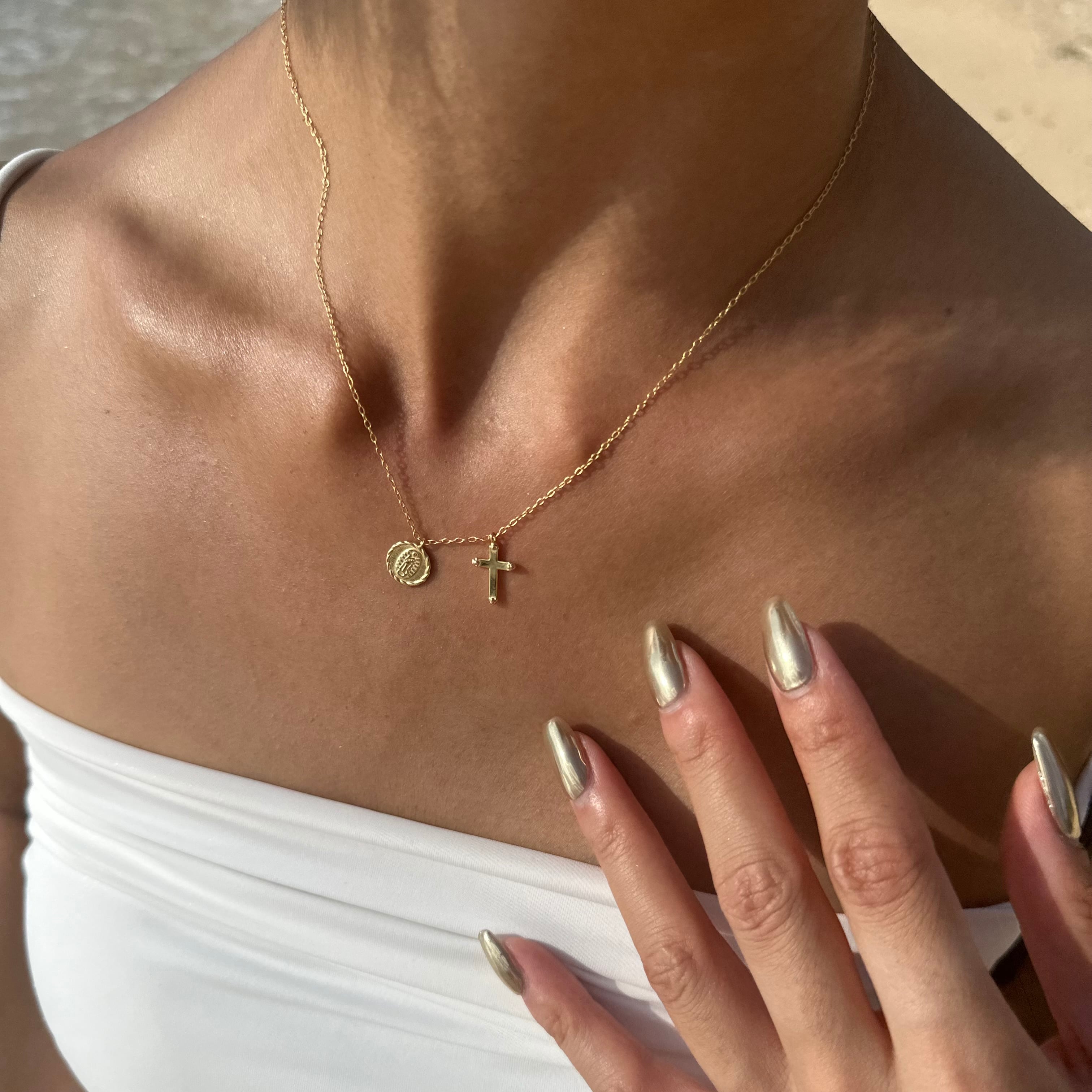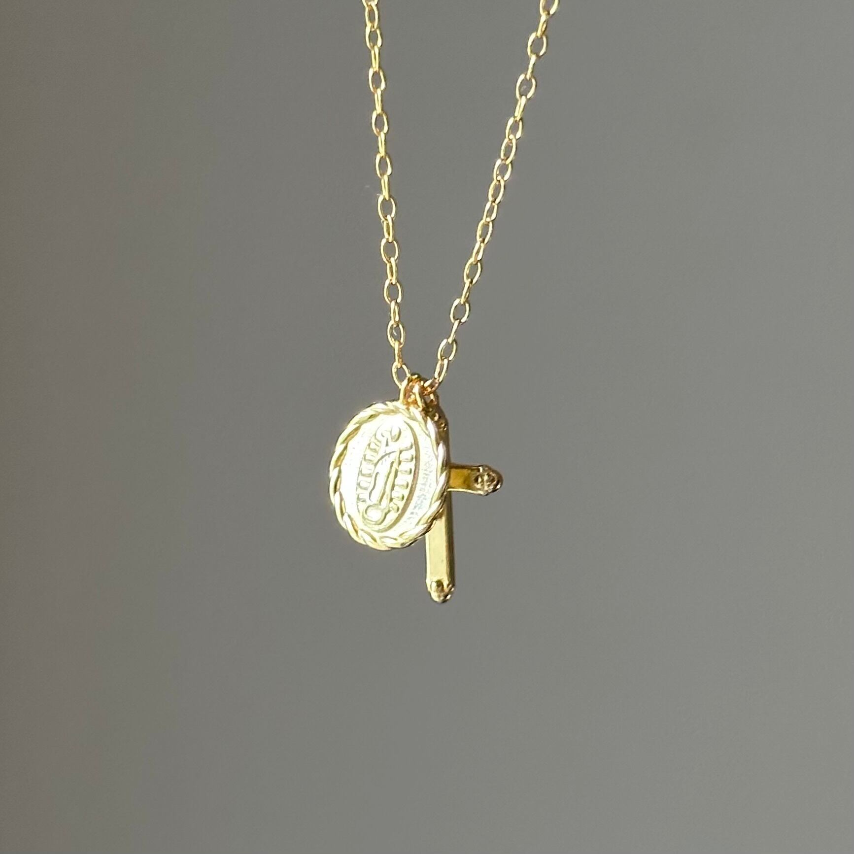 控え目なデザインが、付けっぱなしでも上品さをキープするメタル&クロスモチーフのネックレス。