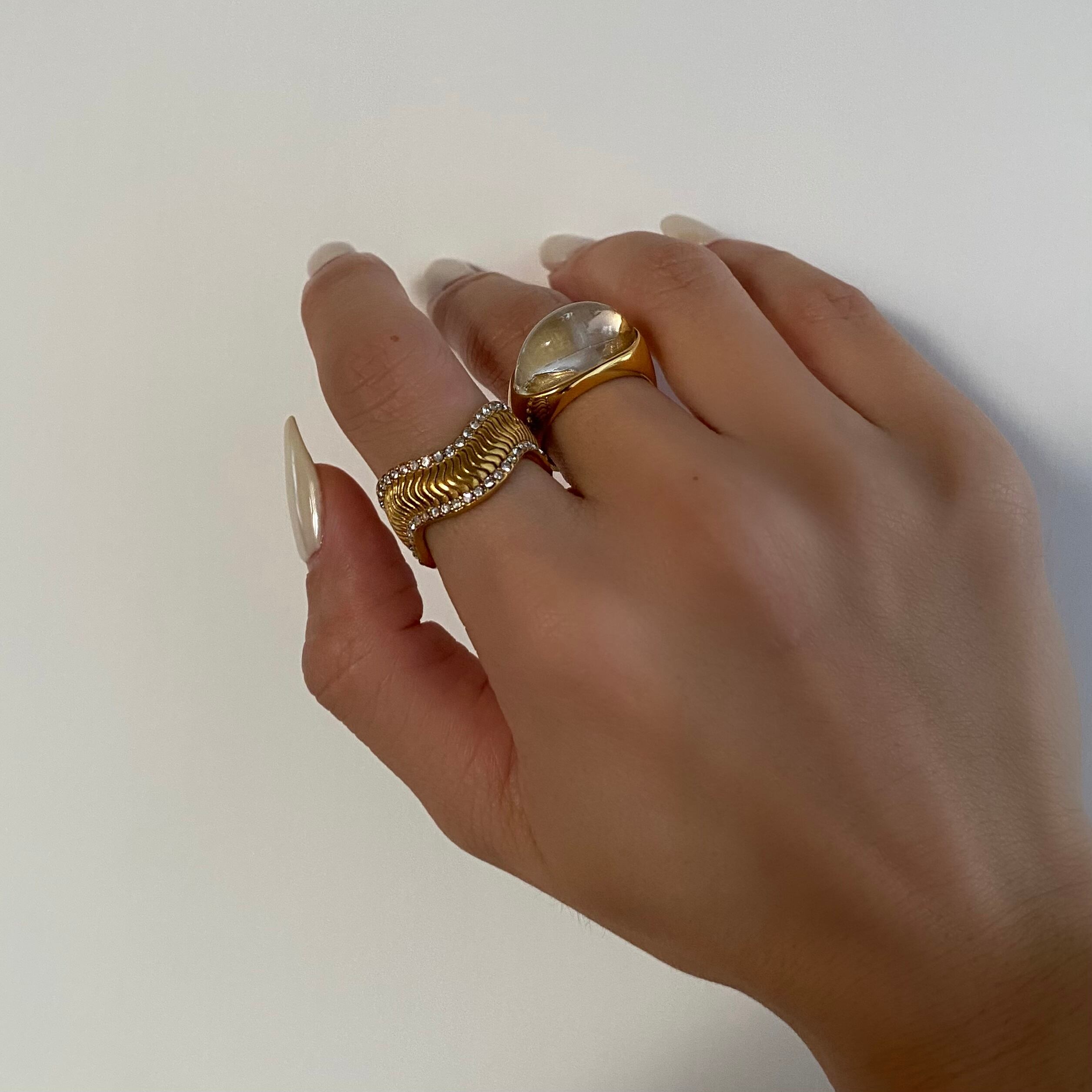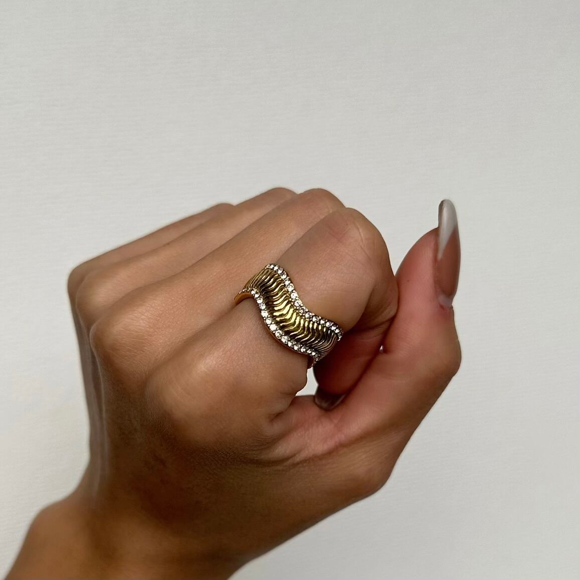 波のようなキラキラの輝きが魅力の「CRYSTAL WAVY BABY RING」。軽やかなデザインの指輪は、まるで波のように指先に馴染みます。キラキラと輝くクリスタルが、あなたの手元を美しく演出してくれること間違いなしです。